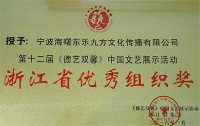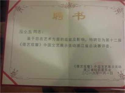 2016年1月1日,新年伊始,持续2个月的第十二届《德艺双馨》中国文艺展示活动浙江赛区总决赛终于在宁波九龙湖圆满落幕。我校校长马小东老师被聘为浙江省总决赛评委,多名参赛选手在会上均有不俗的表现,赢得了现在观众的阵阵掌声,获得了优秀的成绩,后我校被评为第十二届《德艺双馨》中国文艺展示活动浙江省优秀组织奖!